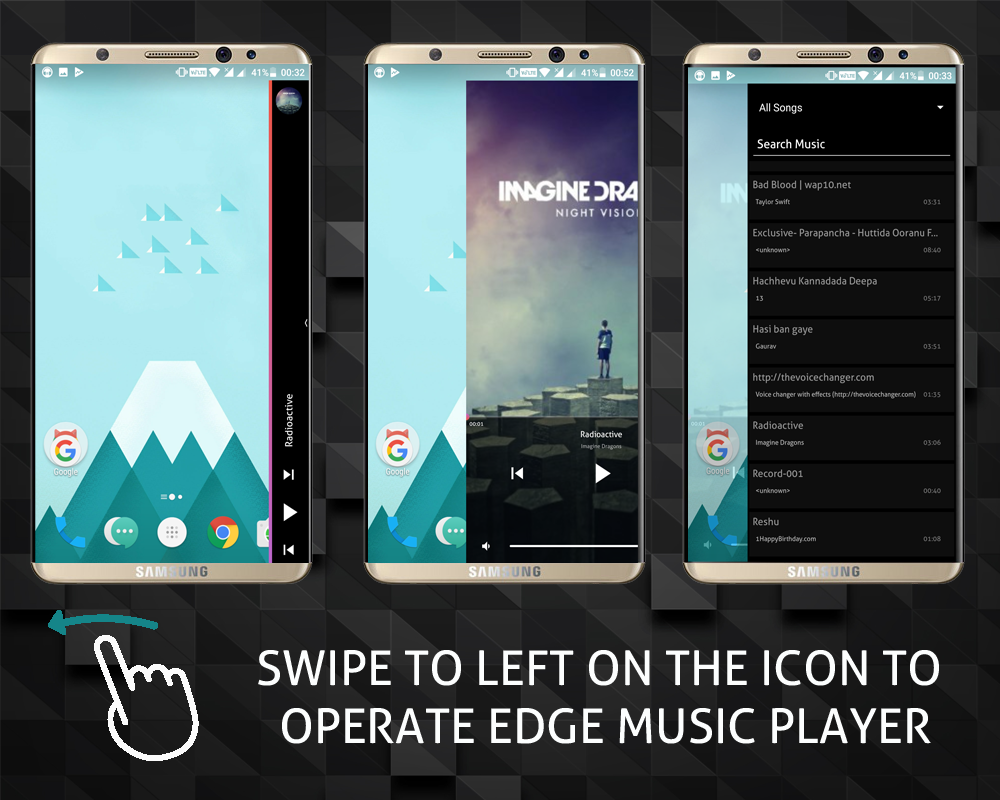 Siempre que necesite el reproductor de música borde, lo que necesita para encenderlo desde la aplicación. La interfaz de usuario se hace simple y comprensible, para proporcionar dinamismo a la aplicación, la interfaz de usuario cambia de acuerdo con el álbum arte de la canción. Puede ajustar el área de activación de la aplicación que proporciona la flexibilidad necesaria para aplicaciones como esta. Con función de compartir instantánea, puede compartir su canción favorita con todas las aplicaciones disponibles en el teléfono haciendo el intercambio de canciones muy fácilmente. La interfaz está diseñada para cambiar los colores con frecuencia para que se vea atractivo.